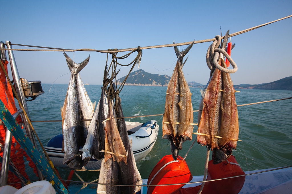 선미에 매달아놓은 원시적인 트롤링 낚시에 고기가 많이 잡혀 회를 실컷 먹은 뒤 남은 것은 소금을 뿌려 해풍에 말리고 있습니다.